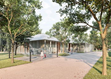 a vzrostlé stromy. Pavilon tak nepůsobí jako solitér, ale jako přirozená součást místa, která podporuje pohyb, sdílení i každodenní radost z pobytu venku i uvnitř.