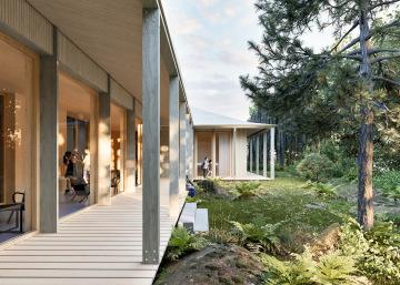 Tři vzájemně propojené dřevěné hmoty se stanovými střechami vytvářejí přívětivý celek, který citlivě navazuje na okolní krajinu i měřítko zástavby. Důraz je kladen na propojení interiéru s exteriérem, variabilitu využití
