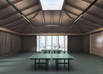 Sportovní pavilon je navržen jako klidné a přirozené místo pro setkávání, pohyb i odpočinek, inspirované jednoduchostí skautské chaty a duchovní atmosférou japonského dojo.