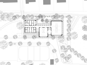 Okolní prostředí je navrženo jako přirozené pokračování samotného pavilonu. Vstupní prostranství se zelení vybízí k setkávání, navazující travnaté plochy podporují komunitní aktivity a klidová zahrada u potoka nabízí prostor pro ztišení.