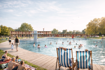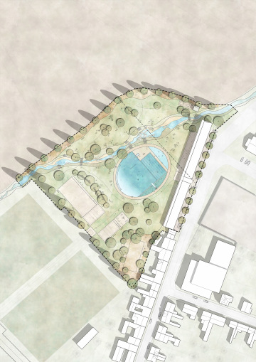 k frekventovaným koupalištím v Brně i k rozlehlé přehradě – s atmosférou přírodního koupaliště na okraji města. Návrh maximálně využívá stávající terén, vodní prvky i zeleň a klade důraz na ekologické, hygienické i klimatické benefity vody.