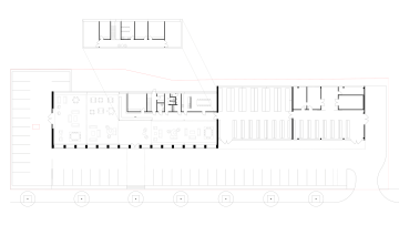Návrh zachovává původní objem hal a pracuje především s jejich vnitřní reorganizací a jasným urbanistickým členěním na dvě části – showroom a sklad. Sjednocením atiky vzniká čitelná kompozice, která definuje jednotlivé provozy a zároveň sjednocuje výraz celku. Přední část objektu je orientována do ulice a formována jako aktivní parter s výlohami, zatímco zázemí směrem k železnici zůstává utilitární.